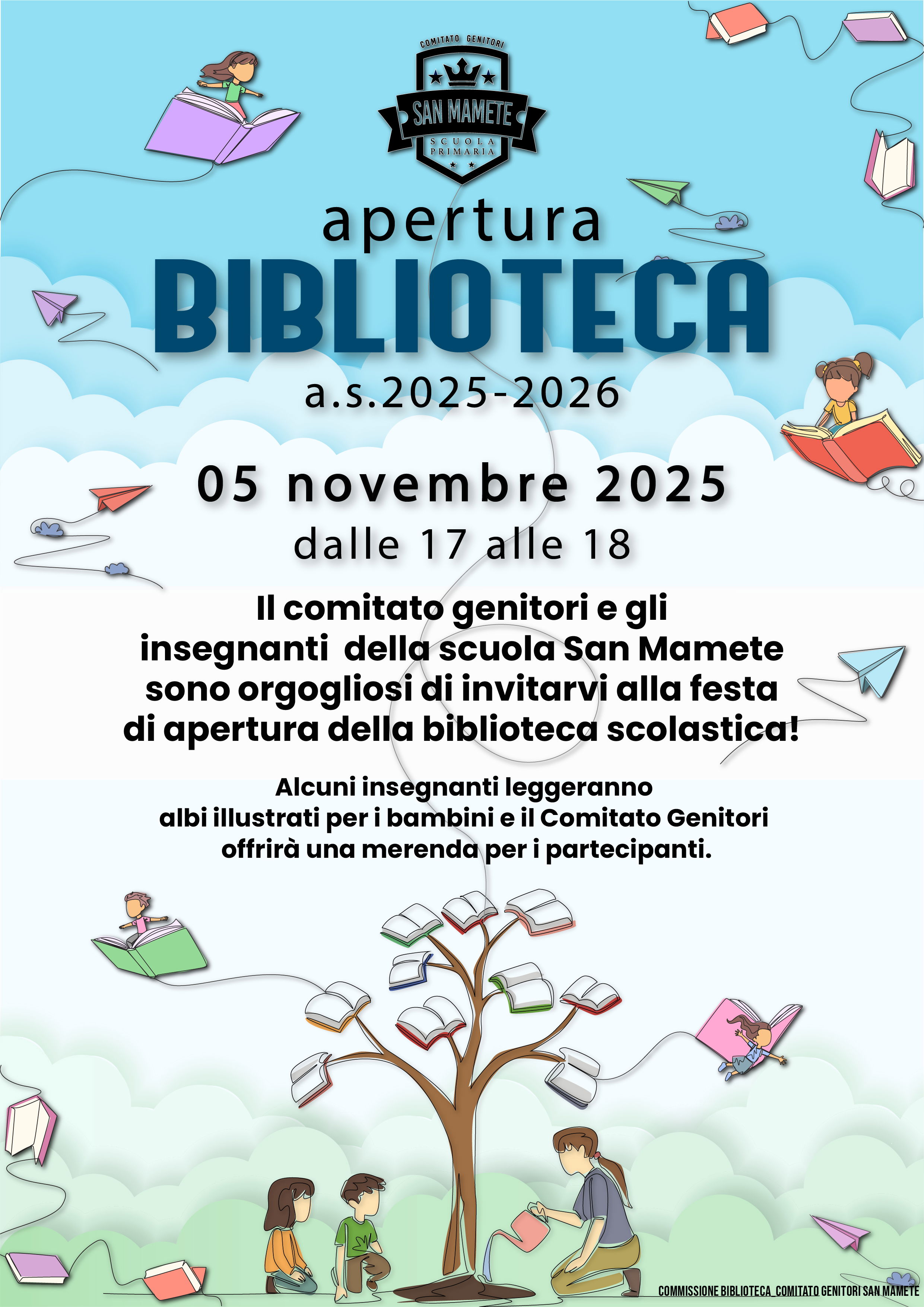 Il Comitato Genitori e gli Insegnanti della Scuola San Mamete sono orgogliosi di invitarvi alla festa di apertura della biblioteca scolastica!